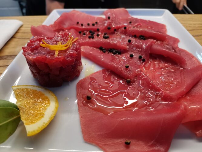 Posso dire, per concludere, che siamo di fronte a un caso antropologico: come Pietro Leemann col vegetarianesimo, come Arnaldo Degoli con la cucina emiliana, anche qui si tratta di un gigante, i Rosso (Andrea e Cristiano), un gigante con il suo totem, il tonno rosso di Carloforte.