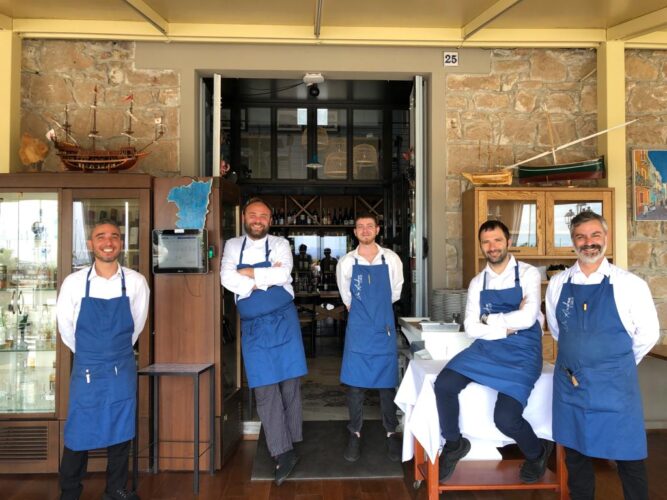 A pochi passi dal porto, la struttura, aperta più che si può, sala e cucina, è ricavata in un palazzo storico che fu sede del sindacato dei battellieri («I battellieri erano stati i primi a organizzarsi in leghe sotto la guida di un socialista piemontese, un medico povero fra i poveri, il dottor Cavallera, il pioniere del socialismo in Sardegna», scrive Giuseppe Dessì) che operò per primo proprio sull’isola di S. Pietro. Ma lo stabile, conosciuto come Palazzo Cavallera, è anche lo stesso del teatro, e, allora, quante suggestioni vengono da tutti i cast di prosa e lirica che si sono messi in gioco su quel palcoscenico! Ed è qui che voglio arrivare: anche Andrea mette in scena un cast, una sua squadra, e ne ricordo quattro in sala, tutti bravissimi. Sembra che quei muri, che trasudano diritti dei lavoratori abbiano inoculato nel suo personale di sala una consapevolezza sindacale sostanziale, non rivendicativa, che vede nella pienezza morale e qualità della guida d’impresa il vero valore che fa crescere il lavoro e porta all’affermazione della professionalità organizzativa: una miscela accorata di competenze, attenzione al cliente, entusiasmo per il prodotto (un vero totem qui, il tonno!) e tanto, tanto rispetto per il bravo capitano storico e anche (“Ed è quasi una magia!” dice Diletto Sapori) per il suo erede e figlio Cristiano, che sta già accumulando il prezioso carisma necessario per la migliore transizione generazionale, sempre fase gravissima in ogni attività economica. E la squadra è anche buon teatro, capacità espressive come nei teatranti. Luca, un esempio originale di maître di sala, lo afferma esplicitamente: “…E lei non ha conosciuto Cristiano, che in questi giorni è a un evento professionale a Porto Scuso, in madre isola…” Diletto, come me, è stupito da quest’affermazione spontanea ed entusiasta: di solito carpiamo al personale critiche più che lodi, soprattutto quando si tratta della seconda generazione, potenzialmente concorrente ai lavoratori professionali per il ricambio futuro al fondatore…