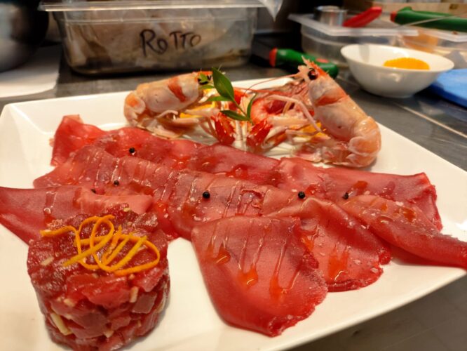 Ringrazio Sergio, il generalista, ma ora tocca a me, Diletto Sapori, dire la mia. Un giovane carlofortino, dell’età di circa 30 anni e impegnato in tutt’altra attività, leggermente in carne (“Voglio essere circondato solo da uomini grassi…” fa dire Shakespeare al suo Giulio Cesare, che vede Cassio magrissimo ed emaciato, dall’aria rancorosa e insoddisfatta, ben prima che gli pianti il pugnale nel corpo insieme e Bruto…) mi fece precocemente l’inventario dell’offerta gastronomica della bell’isola dei genovesi tabarchini: “Ma prima di tutti, caro lei, c’è Andrea! Lui ha i suoi canali per ottenere il miglior tonno della pesca mediterranea ed ha la delicatezza e sensibilità, l’ingegno e la passione per condurlo alla bocca del fruitore nella migliore delle condizioni, cioè in tutti i modi in cui la tradizione e la fantasia lo valorizzano”. Suo parente, si direbbe, sospettai… Invece no; lapidario, ha lo sguardo illuminato: a noi sociologi non sfugge quando c’è la verità. Ed eccola. Strano che si mostri così… E questo è un altro segreto. Qui, nel lontano sud-ovest dei quattro mori, tra aree industriali metallurgiche fallite e tanta distanza dalle centrali logistiche del traffico turistico, a due traghetti di distanza dall’Europa continentale, siamo ancora vicini all’idea di sostanza propria della storia, ove la qualità è romanticamente assoluta, e non un’offerta più lucrosa nella gamma di ciò che si può vendere a turisti e viaggiatori. Siamo lontani dall’over-tourism, malattia diffusa nell’Italia di oggi e anche, sotto certe forme, di tanta Sardegna del nord-est. Alle soglie dell’isola di S. Pietro, bella più di tutte, nota per essere l’isola del genovese antico, degli antichi genovesi fuggiti dalla loro colonia Tabarka nella non lontana Tunisia, e approdati là, già pulsa il cuore Rosso di Andrea. Posso aggiungere sul maître Luca, che egli è l’energia, la positività e l’empatia di Andrea proiettata in sala, un grande assistente di tavola, felicissimamente coadiuvato da una coppia di commis e da un intelligente giovane sommelier, che si esprime in modo sostanziale e avvicina i clienti ai vini con grande senso pratico, competenza e, tratto comune a tutti qui, vera sim-patia, “sentire insieme” al cliente.