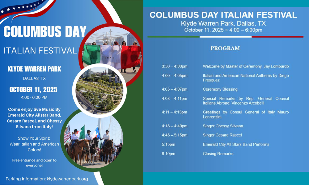 Anche quest’anno nell’undicesimo anniversario del Columbus day in Texas che corrisponde anche al mese del Patrimonio Italo-Americano, si celebra la manifestazione al Klyde Warren Park, nel cuore di Dallas, in un angolo vivace d’Italia, ricco di cultura, musica e spirito comunitario. La manifestazione è organizzata dall’Associazione Siciliani Texas, CSNA ed il CTIM, alla presenza delle Autorità diplomatiche Italiane e Rappresentative della comunità Italo-Americana, e dove si esibiranno dal vivo cantanti e musicisti tra i quali Chessy Silvana, e Cesare Rascel direttamente dall’Italia, insieme all’energia travolgente della Emerald City Allstar Band.