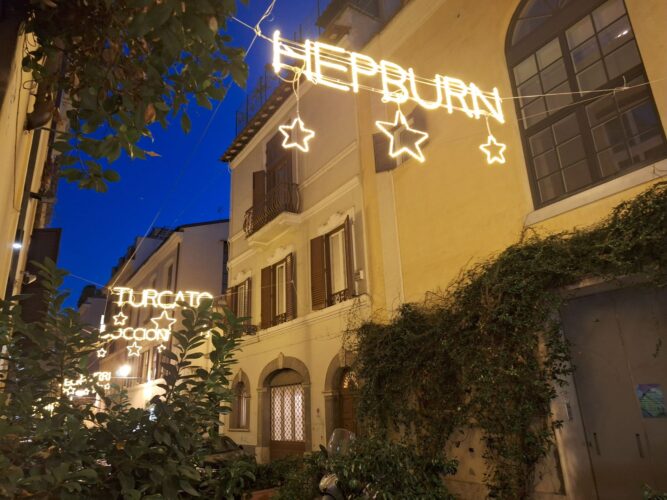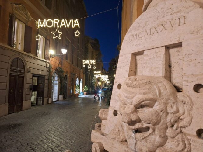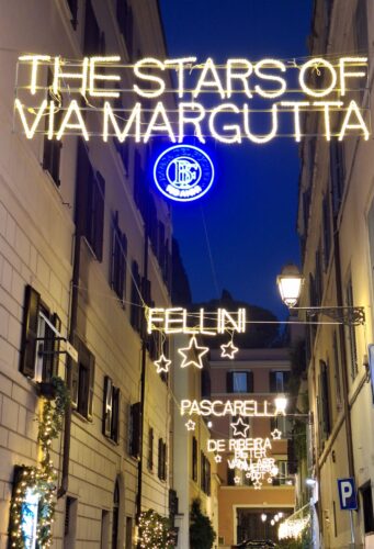 Fellini, Magnani, H. Hepburn e G. Peck, Puccini, Mascagni e Wagner, D’Annunzio, Moravia e Sartre, Picasso, Guttuso e De Chirico e tante altre illustri personalità che hanno popolato e vissuto Via Margutta, rivivono nelle scritte di tre metri realizzate con tubi al neon color oro, collocate lungo la strada, impreziosite e decorate da luminose stelle natalizie.