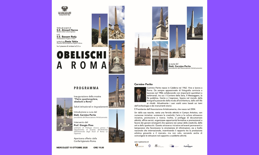 L’Accademia d’Egitto a Roma è lieta di presentare la mostra “Pietra Quadrangolare, Obelischi a Roma.”, un affascinante viaggio artistico e storico firmato da Carmine Perito, dedicato a uno dei simboli più suggestivi e misteriosi del legame millenario tra l’Italia e l’Egitto.