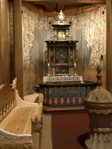 Dentro, il silenzio non è vuoto. Il pavimento in parte scricchiola e l’odore è particolare, misto di resina, legno antico e cera consumata. Appena si entra, si ha la sensazione di fare un salto indietro nel tempo. Tutto è legno. Alte colonne sostengono il soffitto e fanno sembrare la chiesa quasi una foresta al coperto. La luce crea un’atmosfera calma e raccolta. L’altare raffigura scene della vita di Gesù perché al tempo della sua costruzione, intorno al 1200, la Norvegia era già cristiana da un paio di secoli. Prima, i norvegesi seguivano il paganesimo norreno, venerando divinità come Odino e Thor, e anche dopo la conversione, alcune tradizioni sono sopravvissute.