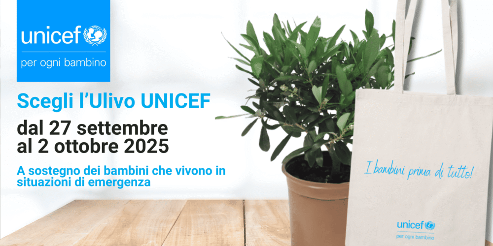 Dal 27 settembre al 2 ottobre, grazie all’impegno dei volontari UNICEF, a fronte di una donazione minima del valore di 15€, sarà possibile ricevere una piantina di ulivo con shopperbag UNICEF in cotone e sostenere in questo modo tanti bambini e bambine vulnerabili nel mondo.